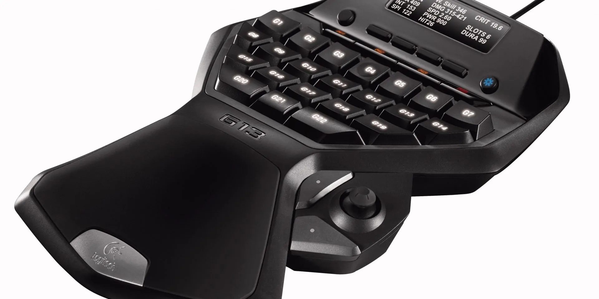 Ko smo prvič zagledali gamepad G13, se nam je zdel precej nenavaden, saj ni stvari na njem, ki bi spominjala na klasično tipkovnico. Same tipke niso označene z črkami, temveč so označene z zaporednimi številkami, za kar rabimo kar precej navajanja. Osvetljene so s poljubno nastavljivo barvo, ki je včasih kar preintenzivna, a lahko svetlost kadarkoli zmanjšamo v nastavitvah. Neverjetno praktičen je tudi ekran v ločljivosti 160×43 pixlov, ki nam prikazuje podatke o računalniku ( zasedenost delovnega pomnilnika in procesorja ), pogovore v priljubljenem igričarskem programu za sporazumevanje, Xfire, uro ter datum, ki zna biti priročna, saj lahko med intenzivnim igranjem kaj kmalu izgubimo občutek za čas :).