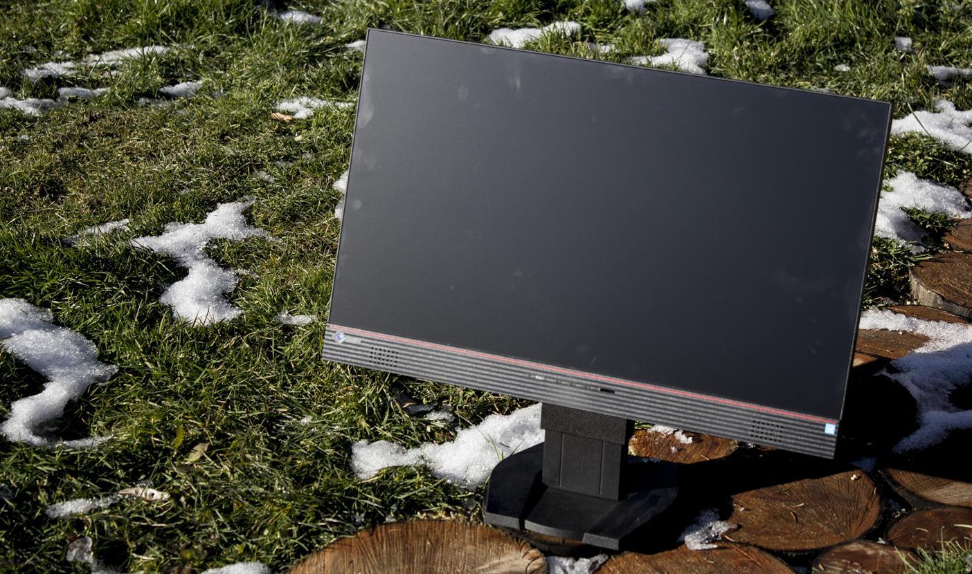 23,8 inčni monitor v 16:9 formatu prikazuje sliko na 1920 po dolžini in 1080 pikslov po širini, torej v Full HD. Design produkta je sila enostaven, z 2 milimetra debelimi robovi na vrhu in na obeh straneh, ter 4 centimetre debeline na spodnji. Izjemna tankost (ki skupaj nanese manj kot pol centimetra) stranic kaže na vnaprej predviden namen uporabe večih monitorjev naenkrat. Barvna paleta izdelka je mat črna z bordo rdečimi dodatki ter smiselno vključenim logotipom na prednji in zadnji strani. Stojalo in baza, ki bi lahko bila bolj robustna, omogoča nastavljanje naklona, obračanje levo in desno, žal pa ekrana ni mogoče rotirati. V samem ohišju so integrirani tudi zvočniki na katere pa lahko brez skrbi pozabimo, saj so bolj provizorične narave, kot namenjeni za dejansko rabo.