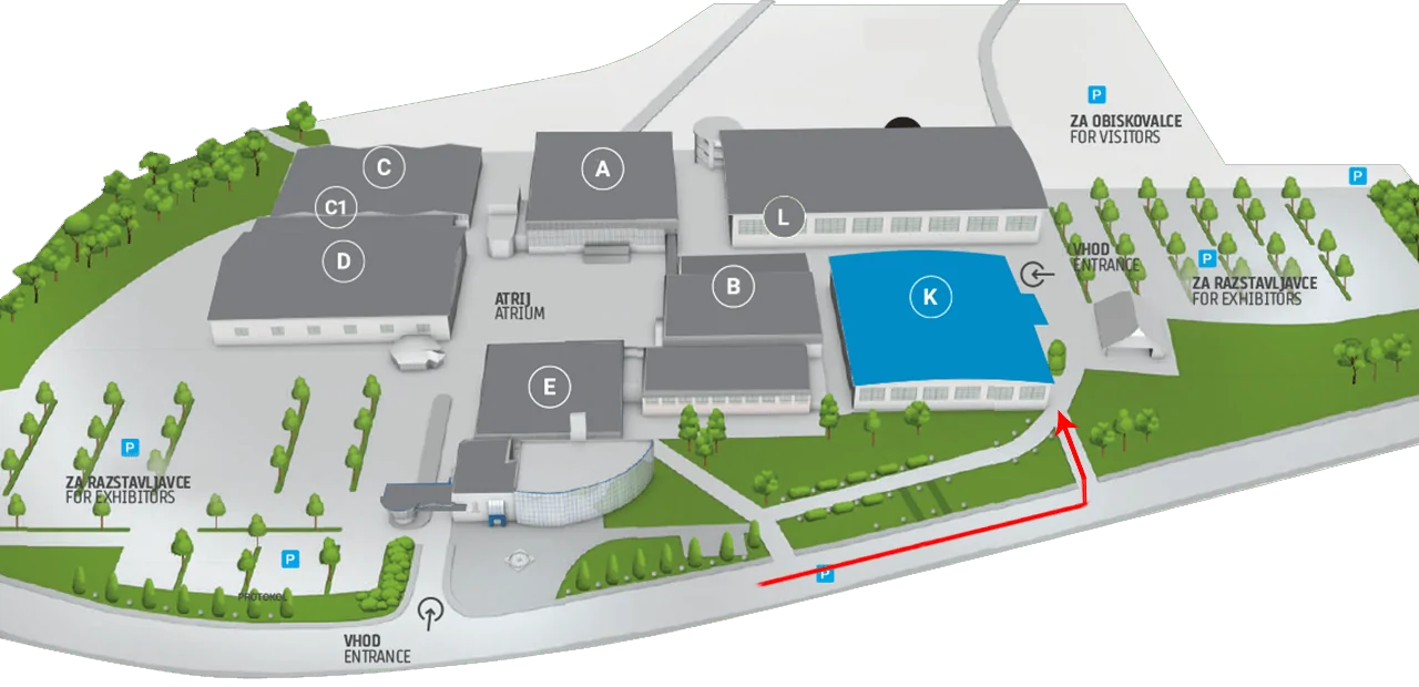 V prilogi dodajamo pot, po kateri se pride na prizorišče, ki je označena z rdečo črto. Ob prihodu se lahko začasno ustavite pred dvorano, nujno prvo opravite check-in in nato znosite opremo na lokacijo dogodka, za tem pa avto umaknete na parkirišče za obiskovalce.